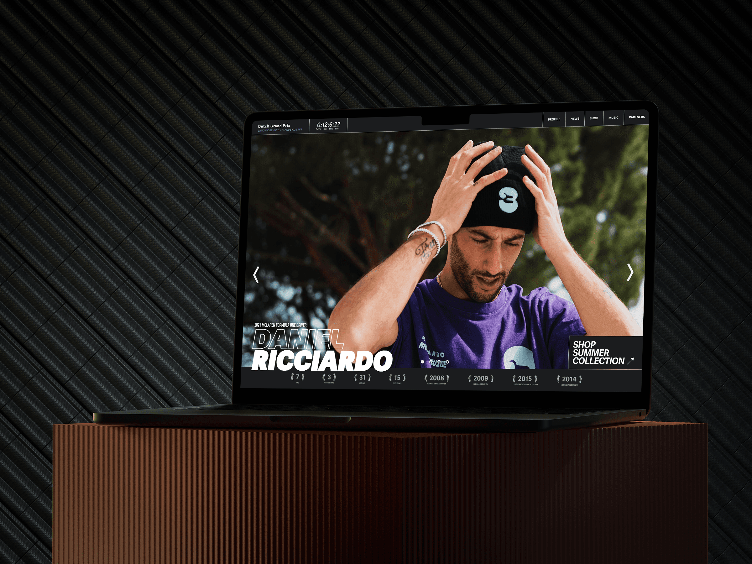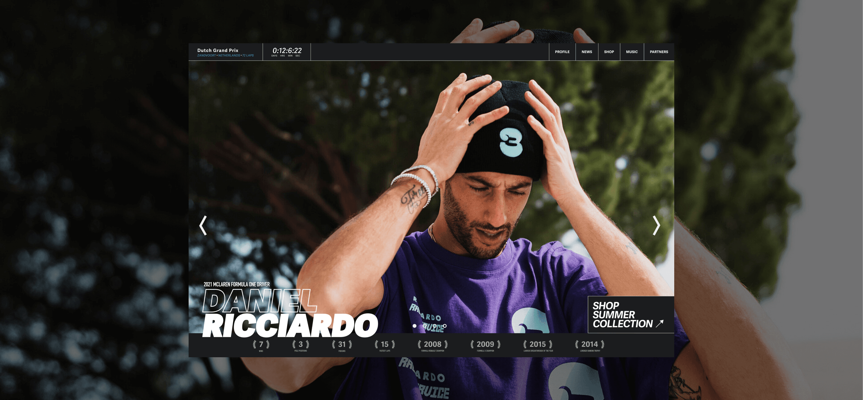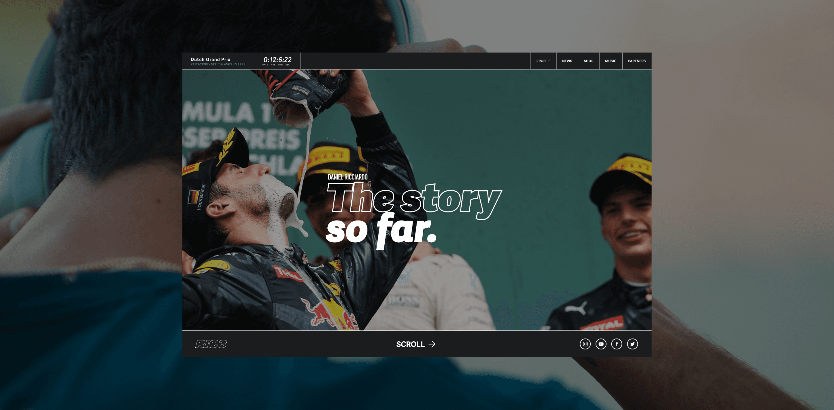 A site concept I did for Formula 1 driver Daniel Ricciardo. Daniel’s existing site does little to highlight his achievements as a multiple-time race winner and one of the more popular drivers on the F1 grid. The current site doesn't draw attention to his large merch store, highly active social and video channels, partnerships, and past accomplishments.