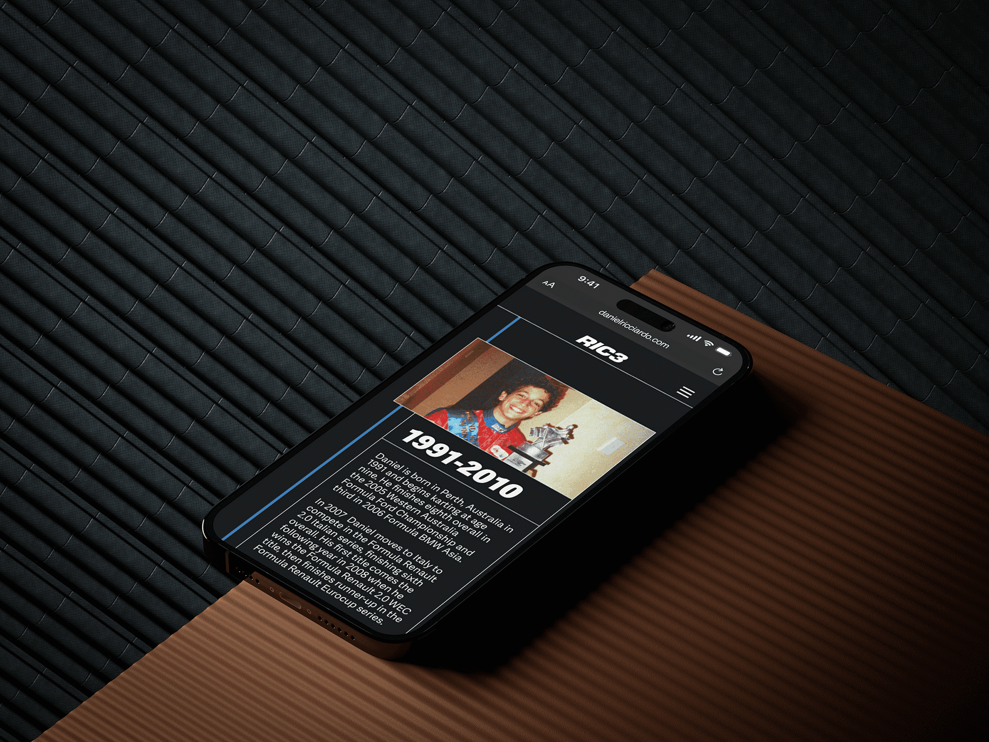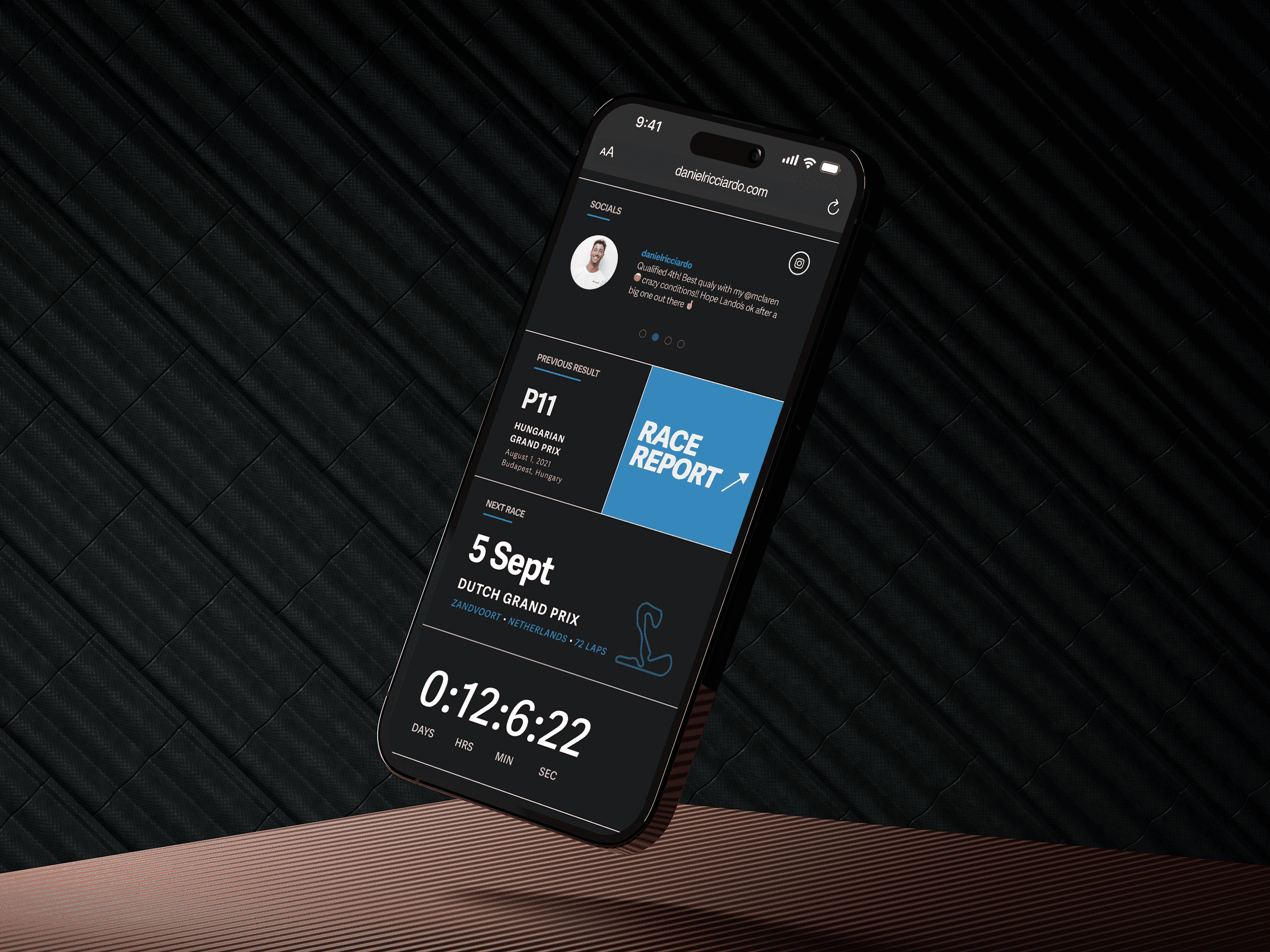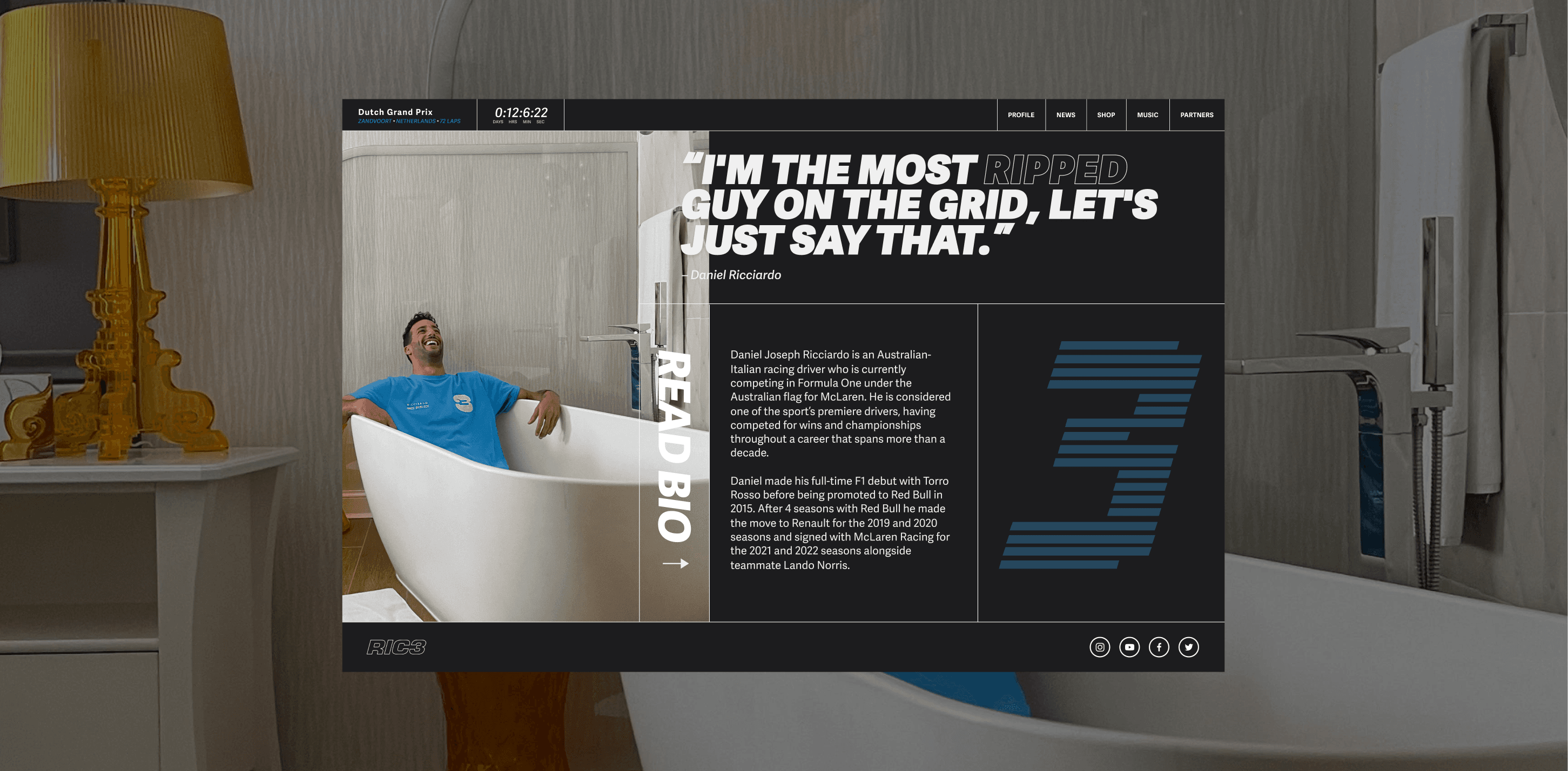 A site concept I did for Formula 1 driver Daniel Ricciardo. Daniel’s existing site does little to highlight his achievements as a multiple-time race winner and one of the more popular drivers on the F1 grid. The current site doesn't draw attention to his large merch store, highly active social and video channels, partnerships, and past accomplishments.