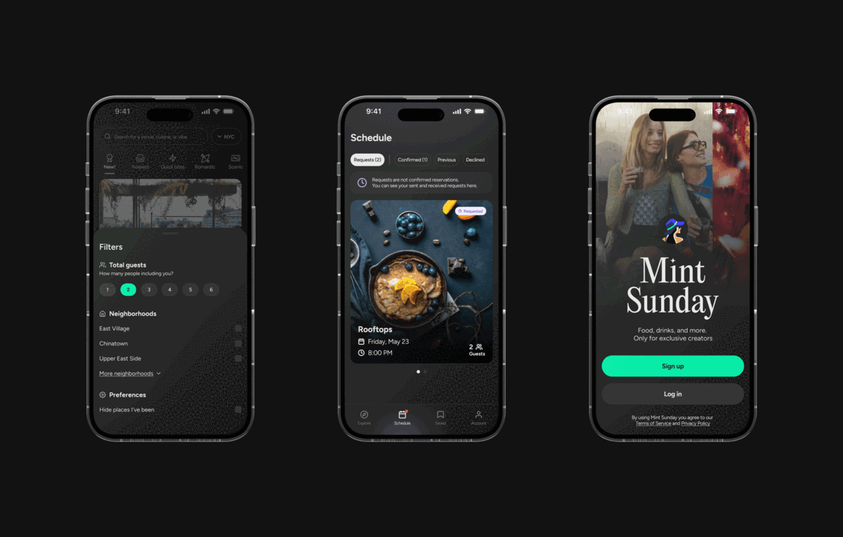 For Mint Sunday, I created the app's brand, mobile app, and venue portal. The platform connects influencers to restaurants and venues in New York City to share and post sponsored content in exchange for food, drinks, and more.